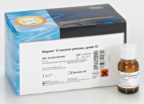 One unit of Roche Applied Science Dispase® equals 181 protease units (PU) measured as release of amino acids equivalent to 1 μg tyrosine per min and ml at pH 7.5 and +37 °C.