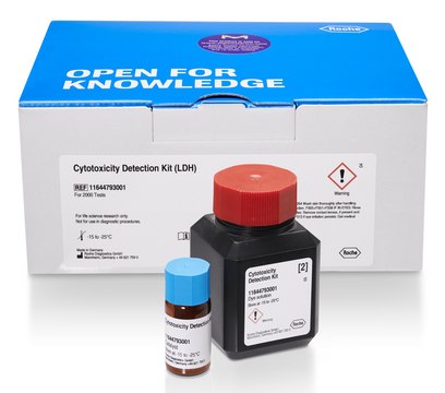 The Cytotoxicity Detection Kit (LDH) is a fast and simple method to quantify cytotoxicity/cytolysis based on the measurement of LDH activity released from damaged cells using the 96-well plate format. Thus, the kit can be used in many different in vitro cell systems when damage to the plasma membrane occurs. For example: