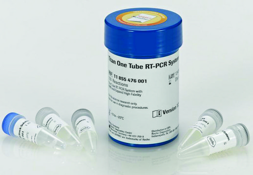The Titan™ One Tube RT-PCR System uses Reverse Transcriptase (RT) Avian Myeloblastosis Virus (AMV) for first strand cDNA synthesis and the Expand™ High Fidelity enzyme blend consisting of Taq DNA Polymerase and a polymerase with a proofreading activity for amplification of cDNA by polymerase chain reaction (PCR). The proofreading activity, leads to an increased PCR fidelity. The Titan One Tube RT-PCR System: