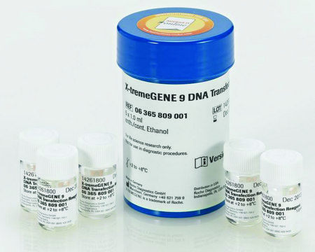 Supplied in 80% ethanol and sterile-filtered through 0.2 μm pore size membrane.Number of Tests: Using the standard procedure, 1 ml of X-tremeGENE 9 DNA Transfection Reagent can be used to perform up to 6,600 transfections in 96-well plates using 3:1 ratio and up to 10,000 transfections using 2:1 ratio.