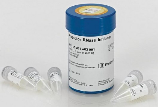 Unit Assay: Activity is measured according to Blackburn as ability to inhibit hydrolysis of cyclic cytidine-2′ : 3′-monophosphoric acid. Under assay conditions, 200 U of Protector RNase Inhibitor inhibits 50% of the activity of 1 μg RNase A.