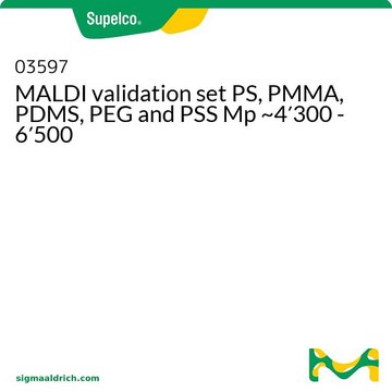 This mixed kit contains one polystyrene, one polymethyl methacrylate, one polydimethylsiloxane, one polyethylene glycol and one polystyrene sulphonate, with Mp ranging from ~4,300 to ~6,500.