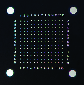 Polysilazane-coated, transparent indium tin oxide target slide, microstructured with an array of 13x13 100 μm diameter spots with a site-to-site distance of 500 μm in both dimensions, produced by picosecond laser ablation. Recipient sites of larger (1.5 mm in diameter) size were machined outside the 13 × 13 array for depositing mass calibrants.