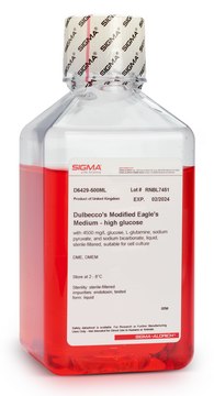Dulbecco′s Modified Eagle′s Medium - high glucose, With 4500 mg/L glucose, L-glutamine, sodium pyruvate, and sodium bicarbonate, liquid, sterile-filtered, suitable for cell culture