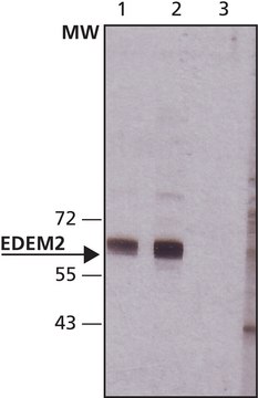 Anti-EDEM2 antibody produced in rabbit is suitable for indirect immunofluorescence and immunoblotting at a working concentration of 0.5-1.0μg/mL using whole extracts of human HepG2 and rat NRK cells.
