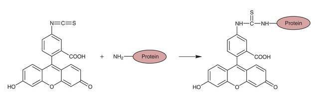 Sigma offers a convenient kit for preparing FITC-labeled antibodies. Fluorescein isothiocyanate (FITC), Isomer 1, is a widely used fluorophore, popular because of its high quantum efficiency and stability when conjugated. FITC is yellow-orange in color with an absorption maximum at 495 nm. Upon excitation it emits a yellow-green color with an emission maximum at 525 nm. Conjugation occurs through free amino groups of proteins or peptides, forming a stable thiourea bond (see reaction). FITC conjugates of antibodies, lectins, hormones, and growth factors have been used in a variety of immunohistochemical and flow cytometry applications. The protocols have been optimized for antibodies, but may be adapted to other proteins by the end user.