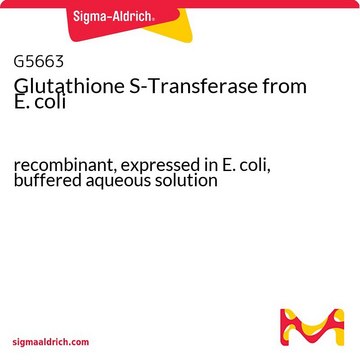 GST is supplied as a solution in phosphate buffered saline containing 0.02% sodium azide. Every lot of material supplied will have 5 mg total enzyme, at a concentration greater than 0.1 mg/ml, typically 1.0 mg/ml.