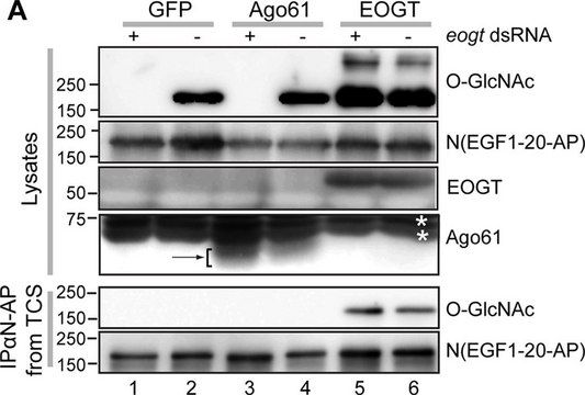 Monoclonal Anti-β-O-Linked N-Acetylglucosamine (mouse IgM isotype) is derived from the hybridoma CTD110.6 produced by the fusion of mouse myeloma cells (P3X63-Ag8.653 cells) and cells from BALB/c mice immunized with a synthetic peptide YSPTS(O-GlcNAc)PSK conjugated to KLH. This antibody recognizes O-GlcNAc in β-O-glycosidic linkage to both serine and threonine and does not cross react with α-linked Ser/Thr-O-GlcNAc, α-linked Ser-O-linked N-acetylgalactosamine or N-linked oligosaccharides on ovalbumin and immunoglobulin G. O-linked N-acetylglucosamine (GlcNAc) transferase (OGT) has 13.5 tetratricopeptide-repeats (TPR) and a globular catalytic domain. The gene encoding this protein is localized on human chromosome Xq13.1.