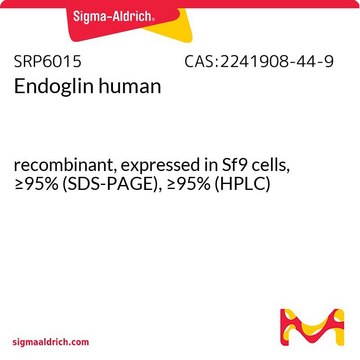 Endoglin is a type I membrane glycoprotein located on cell surfaces and is part of the TGF beta receptor complex. Endoglin consists of a homodimer of 180 kDa with disulfide links. It has been found on endothelial cells, activated macrophages, fibroblasts, and smooth muscle cells. Endoglin has been found to be part of the TGF-beta1 receptor complex. It thus may be involved in the binding of TGF-beta1, TGF-beta3, Activin-A, BMP-2, and BMP-7. It has been postulated that Endoglin is involved in the cytoskeletal organization affecting cell morphology and migration. Endoglin has a role in the development of the cardiovascular system and in vascular remodeling. Its expression is regulated during heart development. CD105 Human Recombinant extracellular domain produced in baculovirus is a homodimeric, glycosylated, polypeptide containing 586 amino acids and having a molecular mass of 61 kDa, but as a result of glycosylation, migrates at 90 kDa under reducing conditions in SDS-PAGE. The CD105 is fused to a C-terminal His-tag (6xHis) and purified by proprietary chromatographic techniques.