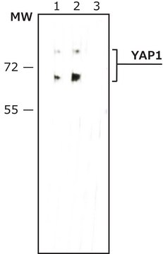 indirect ELISA: suitable, indirect immunofluorescence: suitable, western blot: 0.5-1 μg/mL using total cell extract of HEK-293T cells co-transfected with wt YAP and a constitutively active mutant of c-Abl (Δ1-81)