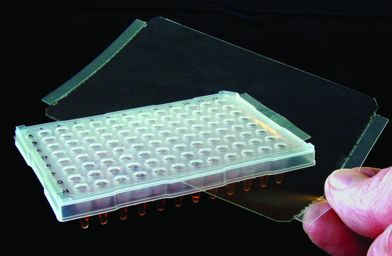 A combination of optically transparent polyester film with a strong, ultra-smooth, non-absorbing, non-fluorescing medical-grade adhesive for superior performance in real-time PCR applications. In place of the customary paper backing, ThermalSeal RT has a plastic liner which is easily removed before use and contributes smoothness and extreme optical clarity to the adhesive. Dimensions are 3.125 x 5.625 in. to seal PCR plates. Length between the perforated ends is 4.8 in.