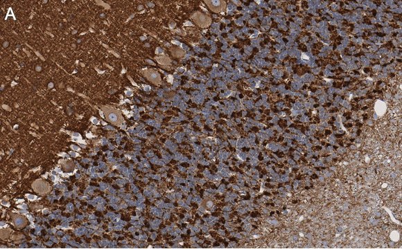 Immunohistochemistry (Paraffin) Analysis: A 1:100 dilution of this antibody detected Synapsin-1 in rat cerebellum tissue sections.Tested applicationsImmunohistochemistry (Paraffin) Analysis: A 1:100 dilution from a representative lot detected Synapsin-1 in human cerebral cortex tissue sections.Affinity Binding Assay: A representative lot of this antibody bound Synapsin-1 peptide with a KD of 8.2 x 10-8 in an affinity binding assay. Immunofluorescence Analysis: A 1:100 dilution from a representative lot detected Synapsin-1 in rat cerebellum tissue sections.Immunocytochemistry Analysis: A 1:100 dilution from a representative lot detected Synapsin-1 in E18 rat cortical neurons.Note: Actual optimal working dilutions must be determined by end user as specimens, and experimental conditions may vary with the end user