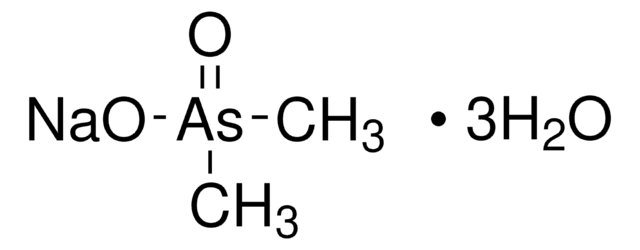 Sodium cacodylate is an organic arsenic compound that is metabolized to produce inorganic, trivalent arsenic in vivo. Sodium cacodylate has been used as a source of arsenic in toxicological research. It is used as a buffer with an effective pH buffering range of 5.1-7.4. In microscopy studies, the buffering capacity of cacodylate prevents excess acidity that may result from tissue fixation.