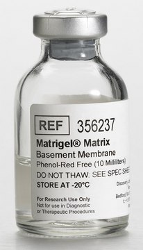 Corning Matrigel Matrix Phenol Red-free, *LDEV-free, 10 mL, is recommended for assays that require color detection (e.g. fluorescence). Corning Matrigel matrix is a solubilized basement membrane preparation extracted from the Engelbreth-Holm-Swarm (EHS) mouse sarcoma, a tumor rich in extracellular matrix proteins, including Laminin (a major component), Collagen IV, heparan sulfate proteoglycans, entactin/nidogen, and a number of growth factors.