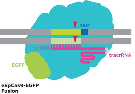 Recombinant enhanced specificity Cas9-GFP protein from Streptococcus pyogenes (~192 KD) is a ready-to-use reagent for genome engineering experiments. When combined with target-specific guide RNAs, eSpCas9-GFP protein will act as a targeted nuclease suitable for transfection of cell cultures and for the accelerated development of genetically-modified animals via one-cell embryo injection.