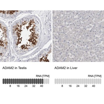 Anti-ADAM2 antibody produced in rabbit, a Prestige Antibody, is developed and validated by the Human Protein Atlas (HPA) project . Each antibody is tested by immunohistochemistry against hundreds of normal and disease tissues. These images can be viewed on the Human Protein Atlas (HPA) site by clicking on the Image Gallery link. The antibodies are also tested using immunofluorescence and western blotting. To view these protocols and other useful information about Prestige Antibodies and the HPA, visit sigma.com/prestige.