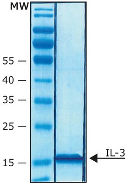 IL-3 is a hematopoietic growth factor that promotes the survival, differentiation and proliferation of committed progenitor cells of the megakaryocyte, granulocyte-macrophage, erythroid, eosinophil, basophil and mast cell lineages. Produced by T cells, mast cells and eosinophils, IL-3 enhances thrombopoieses, phagocytosis, and antibody-mediated cellular cytotoxicity. Its ability to activate monocytes suggests that IL-3 may have additional immunoregulatory roles. Many of the IL-3 activities depend upon co-stimulation with other cytokines. IL-3 is species-specific, variably glycosylated cytokine. Recombinant murine IL-3 is a 15.1 kDa globular protein containing 135 amino acid residues.