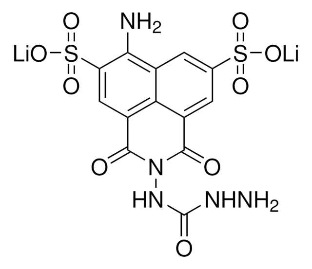 Lucifer Yellow CH is the hydrazine (-NH-CO-NH-NH2) form of the dye compared to Lucifer Yellow VS, which is the vinyl sulfone (-Ph-SO2-CH=CH2) form. Lucifer Yellow CH dilithium salt is a fluorescent dye(1) comprising of amino, sulfo and phenyl-N-hydrazinocarbonylamino substituents on the naphthalimide chromophore. The hydrophilic nature of Lucifer yellow CH underlies its numerous applications as a stain of living cells and tissues.