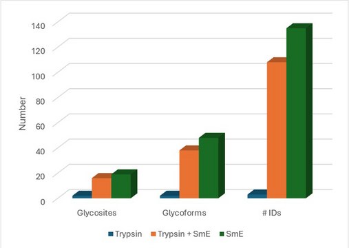 Mucinase SmE is a mucin-selective protease that has been engineered to have high activity and and tolerance for site ocupancy and glycoform complexity. Mucinase SmE provides a complementary cleavage profile to Mucinase StcE (Cat No SAE0202). Contrary to StcE digestion that requires an additional tryptic digest prior to MS peptide analysis, when using Mucinase SmE analysis can be done with SmE alone. It is recommended to perform both options to obtain maximal coverage.