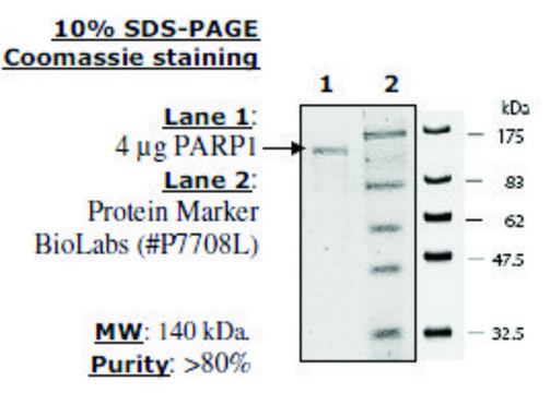 PARP1 Active human has been used in GST-PARP1 pulldown, to study the alterations in protein-protein interactions of sex determining region Y-box 2 (SOX2) upon O-GlcNAcylation. It has also been used in in vitro PARylation assay to investigate the effect of NR1D1 on DNA repair after damage induced by doxorubicin in breast cancer cells. It is useful for the study of enzyme kinetics, screening inhibitors, and selectivity profiling.