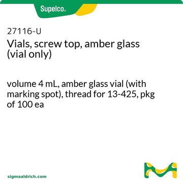 Amber glass vials (volume 4 mL, with marking spot) are useful in preventing the sensitive analyte under investigation from exposure to UV light. Screw top vials are used on many autosamplers with a standard opening of 8 mm. The threads on the standard vials are 13-425.