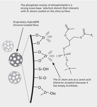 HybridSPE-Phospholipid technology is a simple and generic sample prep platform designed for the gross level removal of endogenous protein and phospholipid interferences from biological plasma and serum prior to LC-MS or LC-MS/MS analysis. Biological plasma or serum is first subjected to protein precipitation via the addition and mixing of acidified acetonitrile. Precipitated proteins are then removed by centrifugation and the resulting supernatant is loaded on the HybridSPE-Phospholipid 96-well plate or cartridge which acts as a chemical filter that specifically targets the removal of endogenous sample phospholipids. The phospholipid retention mechanism is based on a highly selective Lewis acid-base interaction between the proprietary zirconia ions functionally bonded to the HybridSPE-Phospholipid stationary phase and the phosphate moiety consistent with all phospholipids. The resulting eluent is ready for immediate LC-MS or LC-MS-MS analysis.