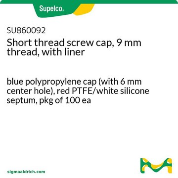 Short thread screw cap, 9 mm thread, with liner is suitable for use with short thread (11.6 X 32 mm) autosampler vials. The PTFE/rubber septa are compatible with most organic solvents until pierced and are not recommended for aromatics, carbon disulfides, chlorinated solvents, hydrocarbons. The blue polypropylene cap can withstand temperature up to 135 °C.