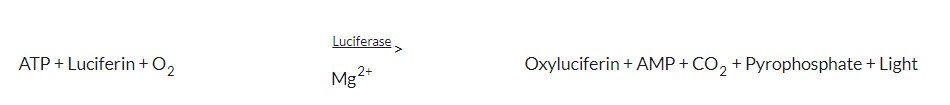 In a 0.051 ml reaction mix, the final concentrations are 0.15 mM Luciferin, 49 mM glycine, 0.98 mM Tris, 7 mM magnesium sulfate, 0.7 mM EDTA, 0.1% (w/v) BSA, 0.1% (w/v) Sodium Azide, 20 nM ATP, and 0.2 µg protein of Luciferase.