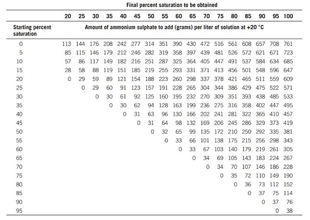 The quantity of ammonium sulphate required to reach a given degree of saturation varies according to temperature. Table 14 shows the quantities required at +20 °C.