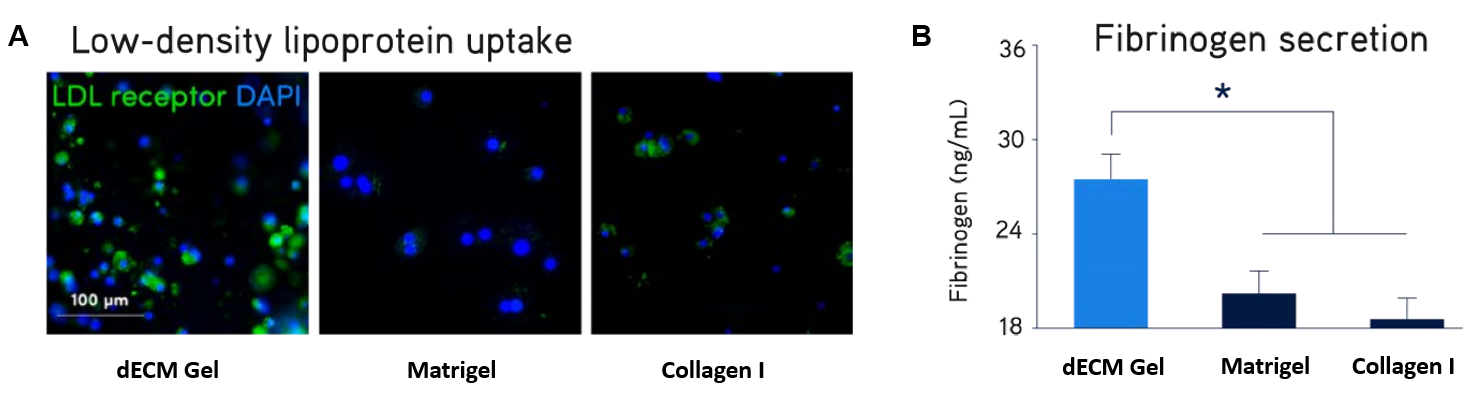 Figure 5. Primary human hepatocyte culture.Primary human hepatocytes showed significantly higher expression of LDL receptor (A) and secretion of fibrinogen (B) when cultured in Liver dECM Hydrogels compared to Matrigel® matrix or Collagen I. Primary human hepatocytes and HepG2 hepatocarcinoma liver cells showed significantly higher 3D structure formation (C), enhanced cytochrome P450 activity (D), and increased glycogen storage (E) when cultured in Liver dECM Hydrogels compared to Matrigel® matrix or Collagen I.