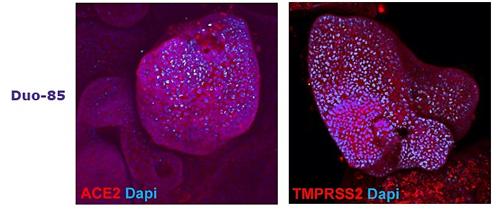 Fig 5: Adult tissue derived colon (SCC321, Colon-87) and duodenum (SCC320, DUO-85) organoids express SARS-CoV-2 related proteins ACE2 and TMPRSS2.