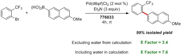 Since the reaction can be run at very high reactant concentration within the Nok micelles, little water is needed, which is why the E Factor did not increase significantly when water was included in the calculation (3.4 vs 7.6).1