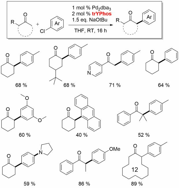 In this series, trYPhos is the most electron-rich YPhos ligand and was found to be active for alpha-arylation of aliphatic cyclic ketones.[7]