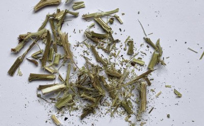 Approximately 10 g of dried buds were weighed into an airtight zip bag and cooled in a freezer at -20 °C for one hour. Subsequently the bag was placed on a hard support and the sample was ground using a wooden household rolling pin. After three to five minutes no further sample breakdown was observed and the process was stopped. Stems in the sample needed to be broken into shorter pieces of approximately 10 mm length by hand. An image of the final sample revealed rather large pieces of stem segments and undamaged seeds in an overall inhomogeneous material (Figure 1).