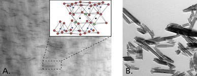 A. TEM micrograph of 2% nylon-clay nanocomposite showing nm-thick platelets of montmorillonite clay fully dispersed in the polymer matrix. Inset shows schematic of montmorillonite aluminosilicate layer structure.