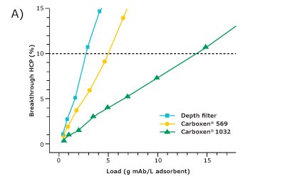 The Carboxen® synthetic carbons demonstrated excellent host cell protein reduction and high mAb yield. Carboxen® 1032 had the best performance among the three materials tested and showed a very good depletion of host cell proteins. At an HCP breakthrough of 10%, 2300 grams of monoclonal antibody per liter of adsorbent could be applied on Carboxen® 1032 and 14 grams of HCP per liter of adsorbent could be depleted. With the addition of a Carboxen® synthetic carbon polishing step to the standard PA-IEX downstream processes, difficult-to-remove lower molecular weight and hydrophobic HCPs can be depleted. With an added synthetic carbon purification step, downstream ion exchangers would bear a lower burden because of the reduction in impurities, so their durability can be increased. Ideally, the implemented step can replace one of the downstream ion exchangers. These points would lead to a reduction in production costs. In an alternative configuration, the Carboxen® synthetic carbon can act as a final polishing step to target the critical HCPs that are not removed in the standard PA-IEX process. Carboxen® synthetic carbons can ultimately lead to the production of a safer mAb product for the patient.
