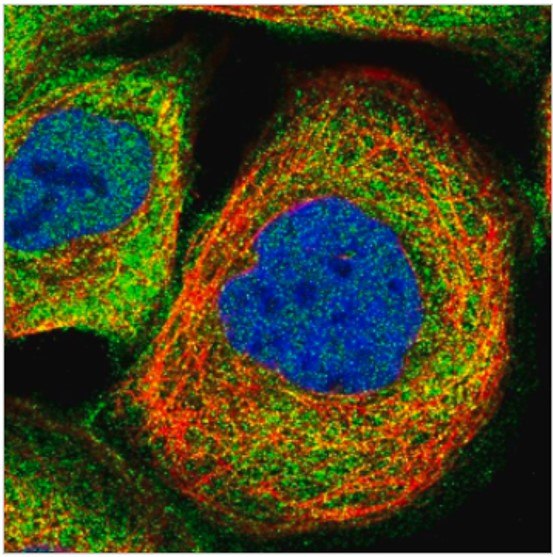 Figure 3.Immunofluorescent staining of human cell line A-431 with anti-SSTR2 polyclonal antibody (Cat. No. HPA007264) shows localization to cytosol, in green. Microtubules are shown in red and nuclei in blue.