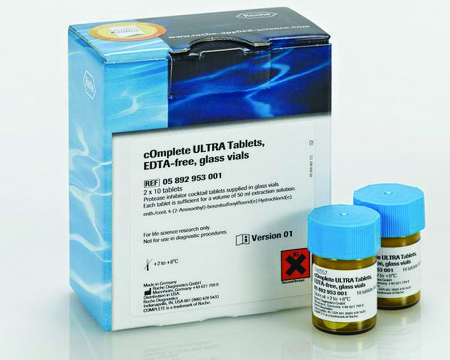 cOmplete ULTRA Tablets,不含乙二胺四乙酸,含有最强的蛋白酶抑制剂鸡尾酒,可最佳保护您的蛋白质免受蛋白酶降解。一片不含乙二胺四乙酸的cOmplete ULTRA Tablets足以容纳50毫升提取液。cOmplete ULTRA Tablets含有不可逆和可逆蛋白酶抑制剂。以玻璃瓶包装供应。或者也可以在易装泡罩包装中。易装提供了最方便的递送方式——单个药片很容易通过泡罩箔片直接推入缓冲区。