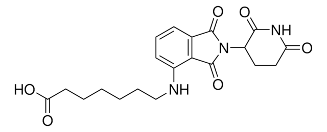 Protein degrader builiding block Pomalidomide-C6-CO2H enables the synthesis of molecules for targeted protein degradation and PROTAC (proteolysis-targeting chimeras) technology. This conjugate contains a Cereblon (CRBN)-recruiting ligand and an alkyl-chain crosslinker with pendant carboxylic acid for reactivity with an amine on the target ligand. Because even slight alterations in ligands and crosslinkers can affect ternary complex formation between the target, E3 ligase, and PROTAC, many analogs are prepared to screen for optimal target degradation. When used with other protein degrader building blocks with a pendant carboxyl group, parallel synthesis can be used to more quickly generate PROTAC libraries that feature variation in crosslinker length, composition, and E3 ligase ligand.