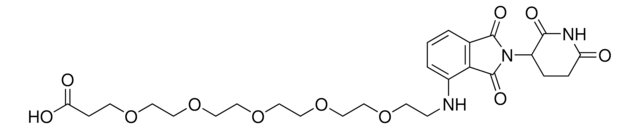 Protein degrader builiding block Pomalidomide-PEG5-CO2H enables the synthesis of molecules for targeted protein degradation and PROTAC (proteolysis-targeting chimeras) technology. This conjugate contains a Cereblon (CRBN)-recruiting ligand and a PEGylated crosslinker with pendant carboxylic acid for reactivity with an amine on the target ligand. Because even slight alterations in ligands and crosslinkers can affect ternary complex formation between the target, E3 ligase, and PROTAC, many analogs are prepared to screen for optimal target degradation. When used with other protein degrader building blocks with a pendant carboxyl group, parallel synthesis can be used to more quickly generate PROTAC libraries that feature variation in crosslinker length, composition, and E3 ligase ligand.