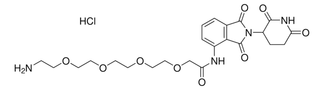 Protein degrader builiding block Pomalidomide-PEG4-NH2 (HCl salt) enables the synthesis of molecules for targeted protein degradation and PROTAC (proteolysis-targeting chimeras) technology. This conjugate contains a Cereblon (CRBN)-recruiting ligand and a PEGylated crosslinker with pendant amine for reactivity with a carboxyl group on the target ligand. Because even slight alterations in ligands and crosslinkers can affect ternary complex formation between the target, E3 ligase, and PROTAC, many analogs are prepared to screen for optimal target degradation. When used with other protein degrader building blocks with a pendant amine, parallel synthesis can be used to more quickly generate PROTAC libraries that feature variation in crosslinker length, composition, and E3 ligase ligand.
