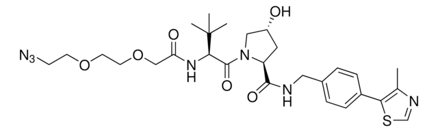 Protein degrader builiding block (S,R,S)-AHPC-PEG2-azide enables the synthesis of molecules for targeted protein degradation and PROTAC (proteolysis-targeting chimeras) technology. This conjugate contains a von Hippel-Lindau (VHL)-recruiting ligand and a PEGylated crosslinker with pendant azide for click chemistry with a target ligand. Because even slight alterations in ligands and crosslinkers can affect ternary complex formation between the target, E3 ligase, and PROTAC, many analogs are prepared to screen for optimal target degradation. When used with other protein degrader building blocks with a pendant azide group, parallel synthesis can be used to more quickly generate PROTAC libraries that feature variation in crosslinker length, composition, and E3 ligase ligand.