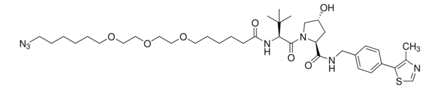 Protein degrader builiding block (S,R,S)-AHPC-C6-PEG3-butyl azide enables the synthesis of molecules for targeted protein degradation and PROTAC (proteolysis-targeting chimeras) technology. This conjugate contains a von Hippel-Lindau (VHL)-recruiting ligand, a linker with both hydrophobic and hydrophilic moieties, and a pendant azide for click chemistry with a target ligand. Because even slight alterations in ligands and crosslinkers can affect ternary complex formation between the target, E3 ligase, and PROTAC, many analogs are prepared to screen for optimal target degradation. When used with other protein degrader building blocks with a pendant azide group, parallel synthesis can be used to more quickly generate PROTAC libraries that feature variation in crosslinker length, composition, and E3 ligase ligand.