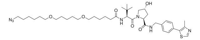 Protein degrader builiding block (S,R,S)-AHPC-C6-PEG1-C3-PEG1-butyl azide enables the synthesis of molecules for targeted protein degradation and PROTAC (proteolysis-targeting chimeras) technology. This conjugate contains a von Hippel–Lindau (VHL)-recruiting ligand, a linker with both hydrophobic and hydrophilic moieties, and a pendant azide for click chemistry with a target ligand. Because even slight alterations in ligands and crosslinkers can affect ternary complex formation between the target, E3 ligase, and PROTAC, many analogs are prepared to screen for optimal target degradation. When used with other protein degrader building blocks with a pendant azide group, parallel synthesis can be used to more quickly generate PROTAC libraries that feature variation in crosslinker length, composition, and E3 ligase ligand.