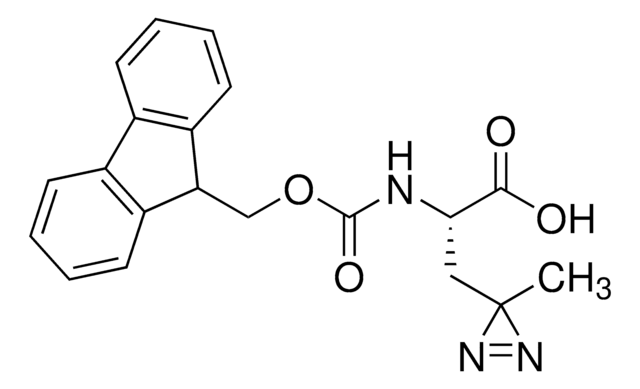 Fmoc-L-Photo-Leucine is a diazirine-containing, Fmoc-protected leucine amino acid and multifunctional photo-crosslinker. Its incorporation into peptides or small-molecule probes and tools allows for photoaffinity labeling of cellular targets and protein-protein interactions upon UV light (∼360 nm) irradiation to form a covalent bond. This and other multifunctional probe building blocks will continue to accelerate drug discovery research for probing cellular mechanisms, target ID/validation, and understanding traditionally undruggable targets. An unprotected version is also available as 907278.