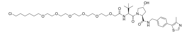 Protein degrader builiding block (S,R,S)-AHPC-PEG6-Butyl chloride enables the synthesis of molecules for targeted protein degradation and PROTAC (proteolysis-targeting chimeras) technology. This conjugate contains a von Hippel–Lindau (VHL)-recruiting ligand, a linker with both hydrophobic and hydrophilic moieties, and a pendant chloroalkane for reactivity with a nucleophilic group on a target ligand. Because even slight alterations in ligands and crosslinkers can affect ternary complex formation between the target, E3 ligase, and PROTAC, many analogs are prepared to screen for optimal target degradation. When used with other protein degrader building blocks with a pendant chloro group, parallel synthesis can be used to more quickly generate PROTAC libraries that feature variation in crosslinker length, composition, and E3 ligase ligand.