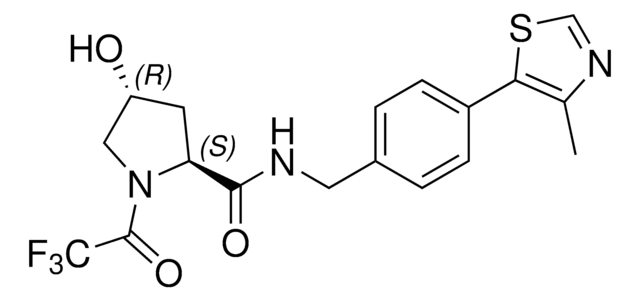 Fluorinated VHL Spy Molecule 3 can be used for the discovery of new von Hippel-Lindau (VHL) binders. Based on VH032 (cat# 901490), this reporter was designed in the lab of Alessio Ciulli to bind the hydroxyproline (Hyp) recognition site of VHL. When used in competition ligand-observed 19F NMR screening experiments, its displacement indicates binding by another molecule. Additional Fluorinated VHL Spy Molecules are available as listings 909416, 909432, and 909459.