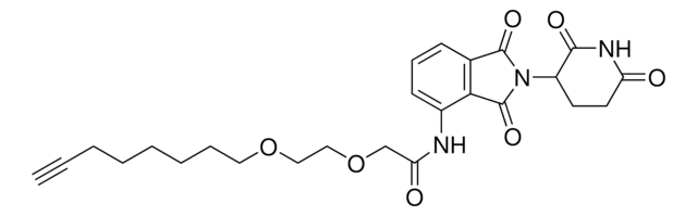 Protein degrader builiding block Pomalidomide-PEG2-butyl alkyne enables the synthesis of molecules for targeted protein degradation and PROTAC (proteolysis-targeting chimeras) technology. This conjugate contains a Cereblon (CRBN)-recruiting ligand, a linker with both hydrophobic and hydrophilic moieties, and a pendant alkyne for click chemistry with an azide on the target ligand. Because even slight alterations in ligands and crosslinkers can affect ternary complex formation between the target, E3 ligase, and PROTAC, many analogs are prepared to screen for optimal target degradation. When used with other protein degrader building blocks with a pendant alkyne, parallel synthesis can be used to more quickly generate PROTAC libraries that feature variation in crosslinker length, composition, and E3 ligase ligand.