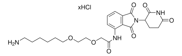 Protein degrader builiding block Pomalidomide-PEG2-butyl amine hydrochloride enables the synthesis of molecules for targeted protein degradation and PROTAC (proteolysis-targeting chimeras) technology. This conjugate contains a Cereblon (CRBN)-recruiting ligand, a linker with both hydrophobic and hydrophilic moieties, and a pendant amine acid for reactivity with a carboxylic acid on the target ligand. Because even slight alterations in ligands and crosslinkers can affect ternary complex formation between the target, E3 ligase, and PROTAC, many analogs are prepared to screen for optimal target degradation. When used with other protein degrader building blocks with a pendant amine, parallel synthesis can be used to more quickly generate PROTAC libraries that feature variation in crosslinker length, composition, and E3 ligase ligand.