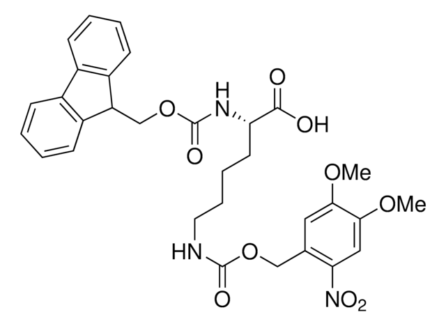 Fmoc-L-Lys(Nvoc)-OH is a lysine derivative compatible with solid-phase peptide synthesis (SPPS). The photolabile, N-terminal protecting group nitroveratryloxycarbonyl (NVOC) can be cleaved by photolysis at 350 nm. Photocaged amino acids such as these are useful in the synthesis of photocleavable chemical tools for spatial and temporal control over released molecules in biological applications.